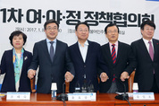 8일 오후 국회에서 열린 제1차 여ㆍ야ㆍ정 정책협의회에서 유일호 부총리 겸 기획재정부 장관과 여야 정책위의장들이 회의에 앞서 기념촬영을 하고 있다. 왼쪽부터 이준원 농식품부 차관, 국민의당 조배숙 정책위의장, 더불어민주당 윤호중 정책위의장, 유 부총리, 새누리당 이현재 정책위의장, 바른정당 이종구 정책위의장, 정은보 금융위 부위원장./연합뉴스