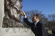 지난 21일(현지시간) 미국 일리노이 주 스프링필드에 있는 에이브러햄 링컨 전 대통령 묘소를 방문한 반기문 유엔 사무총장이 링컨 흉상의 코를 만지고 있다. 링컨 흉상의 코를 만지면 행운이 온다는 속설이 있어 많은 방문객이 이 흉상의 코를 문지른다./연합뉴스