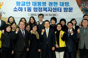 황교안 대통령 권한대행 국무총리와 양복완(앞줄 오른쪽서 2번째) 경기도 행정2부지사가 15일 광명시 소하1동 행정복지센터를 방문, 간담회 참석자들과 기념촬영을 하고 있다./연합뉴스