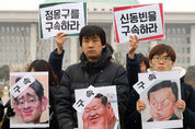 14일 서울 여의도 국회의사당 앞에서 박근혜 퇴진 비상국민행동 재벌구속특위 주최로 열린 재벌총수 끝장 청문회 촉구 기자회견에서 참석자들이 재벌 총수의 얼굴이 그려진 캐리커처를 들고 있다./연합뉴스