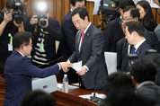 조한규 전 세계일보 사장(왼쪽)이 15일 오후 서울 여의도 국회에서 열린 ‘박근혜 정부의 최순실 등 민간인에 의한 국정농단 의혹사건 진실규명을 위한 국정조사특위 제4차 청문회’에 참석해 김성태 위원장에게 양승태 대법원장 사찰문건을 증거자료로 제출하고 있다./연합뉴스