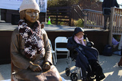 10일(현지시간) 미국 워싱턴DC 내셔널 몰에 있는 야외공연장인 실번 시어터에서 진행된 ‘ 워싱턴 평화의 소녀상 환영식’에서 공개된 소녀상과 일본군 위안부 피해자 길원옥(89) 할머니./연합뉴스