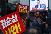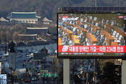 9일 오후 서울 중구 프레스센터 앞 전광판에 박근혜 대통령 탄핵소추안 표결 중계방송이 나오고 있다. /연합뉴스