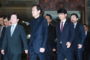 우상호 원내대표 등 더불어민주당 의원들이 9일 오후 박근혜 대통령 탄핵소추안이 가결된 뒤 본회의장을 나서고 있다./연합뉴스