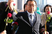 새누리당 이정현 대표가 9일 오후 국회 본회의장에서 열린 박근혜 대통령의 탄핵소추안에 대한 표결을 위해 입장하다 환경운동연합 등 시민단체 회원들이 전달하는 '탄핵찬성 촉구' 꽃다발을 뿌리치고 있다. 꽃다발에는 "촛불을 기억하세요". "탄핵에 찬성하세요"란 글귀가 쓰여 있다. /연합뉴스