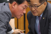 국민의당 박지원 원내대표 7일 오후 국회에서 열린 최순실 국정농단 의혹 진상규명을 위한 국정조사 특위 2차 청문회를 방문해 새누리당 황영철 의원과 대화하고 있다./연합뉴스