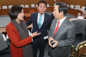 23일 국회에서 열린 박근혜 정부의 최순실 등 민간인에 의한 국정농단 의혹사건 진상규명을 위한 국정조사특별위원회 2차 전체회의에서 김성태 위원장(오른쪽)과 더불어민주당 박영선 의원, 새누리당 황영철 의원이 ‘증인채택’ 문제를 놓고 설전을 벌이고 있다./연합뉴스