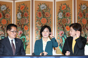 더불어민주당 추미애 대표(가운데), 국민의당 박지원 비상대책위원장(왼쪽), 정의당 심상정 대표가 9일 국회 사랑재에서 야3당 대표 회담을 하고 있다./연합뉴스