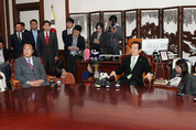 31일 오전 국회의장 주재로 열린 여야 3당 원내대표 회동에서 참석자들이 굳은 표정으로 앉아 있다. 왼쪽부터 국민의당 박지원 비대위원장, 새누리당 정진석 원내대표, 정세균 국회의장, 더불어민주당 우상호 원내대표./연합뉴스