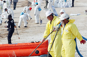 20일 오후 인천시 중구 을왕리해수욕장에서 열린 ‘중부해양경비안전본부 민·관·군 해안방제 합동훈련’에서 참가자들이 오염된 해안지역을 방제하는 훈련을 하고 있다. /연합뉴스