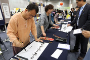 20일 고양시 킨텍스에서 자유학기제 등 박근혜 정부의 6대 교육개혁 과제 추진 상황을 한자리에서 확인하고 다양한 교육 관련 체험을 할 수 있는 ‘2016 대한민국 행복교육박람회’가 개막됐다. 사진은 봉사자들이 캘리그라피 작품을 무료로 써주고 있는 모습. /연합뉴스