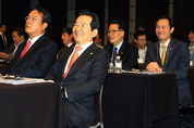 정세균 국회의장과 새누리당 정진석, 더불어민주당 우상호, 국민의당 박지원 원내대표가 10일 오전 서울 소공동 웨스틴조선호텔에서 열린 J글로벌·채텀하우스·여시재 포럼에 나란히 참석해 인사를 나눈 뒤 연사들의 발언을 듣고 있다./연합뉴스