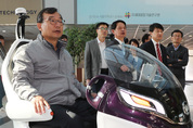 새누리당 이정현 대표가 9일 오후 수원시 영통구 차세대융합기술연구원을 방문, 1인승 무인차를 시승하고 있다./연합뉴스