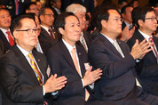 새누리당 정진석(오른쪽 두번째부터 왼쪽으로)·더불어민주당 우상호·국민의당 박지원 원내대표가 5일 오전 서울 잠실 롯데호텔에서 열린 제10회 세계한인의 날 기념식 및 2016 세계한인회장대회 개회식에서 나란히 앉아 박수치고 있다./연합뉴스