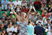 25일 서울 송파구 올림픽공원 테니스코트에서 열린 여자프로테니스(WTA) 투어 코리아오픈 단식 결승에서 모니카 니쿨레스쿠(55위·루마니아)를 세트스코어 2-1(6-0 2-6 6-0)로 꺾고 우승한 라라 아루아바레나(90위·스페인)가 환호하고 있다./연합뉴스