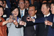 19일 오후 서울 여의도 63컨벤션에서 열린 대한상공회의소 주최 ‘20대 국회의원 환영리셉션’에서 여야 대표들이 건배하고 있다. 왼쪽부터 정의당 심상정 대표, 더불어민주당 추미애 대표, 새누리당 이정현 대표, 박용만 대한상의 회장, 국민의당 주승용 비상대책위원장 직무대행./연합뉴스
