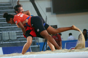 13일 서울 장충체육관에서 열린 2016 추석장사 씨름대회 외국인 여자 학교대항전에서 경희대학교 마리안(오른쪽)과 숭실대학교 효홍이 경기를 펼치고 있다./연합뉴스