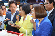 더불어민주당 추미애 대표(가운데)와 소속 의원들과 이재명 성남시장(왼쪽)이 13일 오후 추석을 맞이해 성남시 남한산성 시장 내 전 가게를 찾아 부침개를 맛보고 있다./연합뉴스