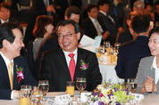 정세균 국회의장(왼쪽부터), 새누리당 이정현 대표, 더불어민주당 추미애 대표가 7일 오후 서울 세종문화회관 세종홀에서 열린 ‘제17회 사회복지의 날 기념식 및 제27회 전국사회복지대회’에 참석해 대화하던 중 밝게 웃고 있다./연합뉴스