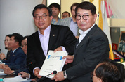 새누리당 이정현 대표(왼쪽)가 8일 오후 서울 남대문로5가 직능경제인단체총연합회를 찾아 오호석 총회장으로부터 각 직능단체 정책 건의서를 전달받고 있다./연합뉴스
