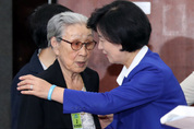 더불어민주당 추미애 대표가 8일 오전 국회에서 일본군 위안부 피해자인 김복동 할머니를 만나 포옹하고 있다./연합뉴스
