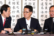 국민의당 박지원 원내대표(가운데)가 5일 오후 국회 귀빈식당에서 열린 야3당 원내대표 회동에서 더불어민주당 우상호 원내대표(왼쪽), 정의당 노회찬 원내대표(오른쪽)와 야당 반대에도 임명이 강행된 김재수 농림축산식품부 장관과 조윤선 문화체육관광부 장관에 대한 대처방안을 논의하고 있다./연합뉴스