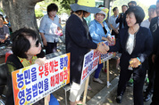 더불어민주당 추미애 대표가 31일 오후 경남 김해 봉하마을에서 마을 농업진흥지역 해제 결정 이행을 요구하는 마을 지주, 경작지 주민들을 만나 인사하고 있다./연합뉴스
