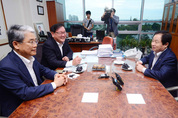 30일 오후 서울 여의도 국회의원회관 김동철 의원실에서 여야 3당 예결위 간사인 새누리당 주광덕(오른쪽부터) 의원, 더불어민주당 김태년 의원, 국민의당 김동철 의원이 회동을 하고 있다./연합뉴스