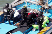 지난 26일 오후 인천시 중구 인천해양경비안전서 전용부두 인근 해상에서 열린 ‘중부해경·해군 불법외국어선 합동단속훈련’에서 해경 대원들이 불법조업 외국어선에 올라타 선원들을 제압하는 훈련을 하고 있다. /연합뉴스