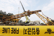18일 오전 여주시의 한 철제빔 제조공장에서 공장에 설치된 높이 20m짜리 노후 타워크레인(T자형) 해체작업 중 이 크레인이 한쪽으로 쏠려 넘어지는 사고가 발생해 6명이 다쳤다. 사고는 노후 크레인 해체를 위해 이동식 타워크레인 2대와 사다리차 1대를 동원해 작업하던 중 노후 크레인이 쓰러지면서 덩달아 이동식 크레인 1대와 사다리차 1대가 전도돼 발생했다. 사진은 사고 현장 모습./ 연합뉴스
