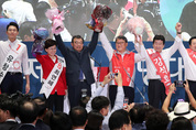 새누리당 이정현 신임 대표가 9일 오후 서울 잠실실내체육관에서 열린 새누리당 제4차 전당대회에서 신임 최고위원들과 함께 환호하고 있다. 왼쪽부터 청년 최고위원 유창수, 최고위원 최연혜, 이 대표, 최고위원 조원진, 강석호, 이장우./연합뉴스