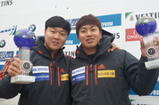 獨 월드컵 2차대회서도 쾌거 1, 2위와 0.34·0.21초 차이 2018년 평창올림픽 메달 청신호 원윤종(30)과 서영우(24·이상 경기도연맹)가 봅슬레이 월드컵에서 두 번 연속 동메달을 따는 기적을 일궜다. 원윤종-서영우 조는 5일 독일 빈터베르크에서 열린 2015~2016 국제봅슬레이스켈레톤경기연맹(IBSF) 월드컵 2차 대회 남자 봅슬레이 2인승에서 동메달을 땄다. 원윤종와 서영우는 지난달 29일 독일 알텐베르크에서 열린 월드컵 1차 대회에서도 동메달을 따는 쾌거를 이룩했다. 봅슬레이 월드컵은 세계에서 내로라하는 선수들이 총출동하는 대회다. 두 선수는 월드컵에서 두 차례 연속 3위에 올라 2018 평창 동계올림픽 메달 가능성을 높였다. 원윤종-서영우 조는 1차 시기에서 55초30으로 4위에 오른 데 이어 2차 시기에서 55초41로 3위를 차지하며 종합 1분50초71로 3위에 랭크됐다. 1위는 1분50초37의 독일 프랑체스코 프레드리히-토르스텐 마르기스, 2위는 1분50초50의 라트비아의 오스카스 멜바디스-다우만츠 드레이스켄스가 차지했다. 월드컵 1차 대회 때와 1, 2, 3위 팀이 똑같다. 1차 대회에서 13위를 차지했던 김동