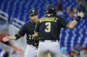 4경기 연속 안타 행진을 했던 강정호(28·피츠버그 파이리츠)가 25일에는 무안타로 침묵했다. 강정호는 이날 미국 플로리다주 마이애이의 말린스 파크에서 열린 마이애미 말린스와의 원정경기에 4번타자 3루수로 선발 출전해 3타수 무안타에 그쳤다. 볼넷은 2개 골라냈고, 이 가운데 한 번의 출루는 득점으로 연결했다. 강정호의 올 시즌 50번째 득점이다. 유격수 자리는 무릎 부상에서 돌아와 이날 처음으로 선발 출격한 조디 머서에게 내줬다. 8번 타자로 나선 머서는 4타수 1안타와 1볼넷 1타점을 올렸다. 강정호는 4번 타자답게 득점 기회에서 타석에 들어섰으나 타점을 올리지는 못했다. 시즌 타율은 0.290에서 0.288(351타수 101안타)로 하락했다. 첫 타석은 1회초 2사 2루 상황이었다. 강정호는 마이애미 선발 톰 콜러와 풀카운트 접전을 벌였지만, 시속 약 153㎞ 직구를 그대로 흘려보내며 삼진을 당했다. 강정호는 3회초 앤드루 매커천의 2타점 2루타로 2-0으로 앞선 직후인 2사 2루에서 타석에 들어섰지만, 유격수 땅볼로 물러났다. 다음은 5회초 무사 만루 상황이었다. 강정호는 2볼-2스트라이크에서 콜러의 시속 약 150㎞ 직구를 강타했지만,
