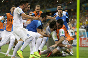 우루과이와 그리스가 2014 브라질 월드컵 축구대회 조별리그 마지막 경기에서 극적인 승리를 거두며 16강에 진출했다. 우루과이는 25일 브라질 나타우의 두나스 경기장에서 열린 이탈리아와의 2014 브라질 월드컵 조별리그 D조 3차전에서 후반 36분 터진 디에고 고딘의 결승골에 힘입어 1-0으로 이겼다. 이미 코스타리카가 16강 진출을 확정한 가운데 이날 반드시 승리해야만 조별리그를 통과할 수 있던 우루과이는 꼭 필요한 ‘한 골’을 뽑아내 승리의 미소를 지었다. 반면 비기기만 해도 16강에 오를 수 있던 이탈리아는 한 명이 퇴장당한 열세 속에서도 특유의 ‘빗장 수비’를 앞세워 잘 버텼으나 한 번의 날카로운 공격을 버텨내지 못했다. 잉글랜드와 비긴 코스타리카가 승점 7점으로 조 1위에 올랐고, 우루과이가 4점으로 이탈리아(3점)를 밀어냈다. 패배는 곧 탈락인 벼랑 끝의 승부인 만큼 경기는 박진감 넘치는 공방전보다는 거친 몸싸움이 오가는 치열한 기 싸움 위주로 진행됐다. 팽팽하던 경기 흐름은 이탈리아의 클라우디오 마르키시오가 우루과이 에히디오 아레발로 리오스의 정강이를 스파이크로 찍었다는 이유로 레드카드를 받으면서 급격히 변했다. 자기 진영으로 완전히 웅크린 이탈