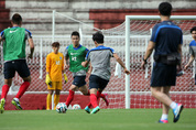 홍명보호(號)가 2014 브라질 월드컵을 향한 본격적인 여정을 시작했다. 홍명보 감독이 이끄는 축구대표팀은 15일(현지시간) 오후 4시15분 전지훈련지인 브라질 파라나주 포즈 도 이구아수시의 아베시(ABC) 경기장에서 올해 첫 훈련을 실시했다. 오프시즌인 K리그, J리그, 중국 슈퍼리그에서 뛰는 선수들로 대표팀이 구성된 만큼 훈련의 시작은 체력을 측정하는 쿠퍼테스트로 시작됐다. 골키퍼 3명을 제외한 선수 20명은 간단하게 몸을 푼 뒤 가슴에 심박측정기를 두른 뒤 본부석 쪽을 향해 일렬로 섰다. 이어 스피커에서 나오는 신호에 따라 사이드라인까지 20m 왕복 달리기를 시작했다. 가장 먼저 하대성(서울)이 오른쪽 종아리에 통증을 호소하며 테스트에서 빠졌고 이어 감기 증상을 보이는 이승기(전북)가 열외됐다. 선수들이 10차례 왕복할 때마다 페이스는 조금씩 빨라졌다. 섭씨 30도에 육박하는 더운 날씨에 훈련 전부터 땀으로 범벅됐던 선수들의 얼굴은 점차 심하게 일그러졌다. 김태영 코치는 선수들의 자세가 흐트러질 때마다 “사이드라인을 반드시 밟아라”라고 불호령을 내렸다. 이어 차례로 김주영(서울), 염기훈(수원), 김신욱(울산), 이호(상주), 이지
