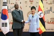 박근혜 대통령은 30일 오전 청와대에서 요웨리 무세베니(69) 우간다 대통령과 정상회담을 하고 양국간 교류협력 강화 방안을 논의했다. 새 정부 출범 이후 국내에서 이뤄진 첫 정상회담이다. 무세베니 대통령은 지난 1986년에 집권한 뒤 1996년부터 2011년 대선까지 4번 연속 대통령에 당선되면서 우간다 근대화작업을 이끌고 있다. 박 대통령은 정상회담에서 수교 50주년을 맞는 우간다와의 통상·투자, 에너지·자원, 새마을운동, 개발협력 등 각종 분야에서 양국간 관심사를 논의했다. 박 대통령은 “21세기 세계경제의 새로운 성장 동력이 아프리카라고 생각하는데 우간다의 놀라운 발전이 이를 상징적으로 말해주고 있다”면서 “무세베니 대통령이 우간다의 미래 청사진을 말씀하실 때 한국의 사례를 언급하신다고 들어서 기뻤는데, 앞으로 이런 발전 경험도 적극적으로 공유하자”고 말했다. 무세베니 대통령은 이에 대해 “한국이 지난 50년간 이룩한 큰 변화는 아프리카에 모범사례가 되고 있다”고 화답하고 박 대통령의 우간다 방문을 공식 요청했다. 이어 양국 정상이 지켜보는 가운데 윤병세&middo