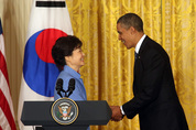 박근혜 대통령과 버락 오바마 미국 대통령은 7일(현지시간) 백악관에서 첫 정상회담을 열고 북한의 도발에는 단호히 대응하되 대화의 문을 열어둘 것임을 확인했다. 특히 오바마 대통령은 북한의 도발위협이 계속되는 상황에서도 억지와 대화를 양축으로 하는 박 대통령의 대북정책 기조인 ‘한반도 신뢰프로세스’에 대한 지지를 표명했다. 또 두 정상은 한미동맹 60주년에 맞춰 향후 수십 년간 양국 관계의 새로운 발전 방향을 제시하는 문건인 ‘한미동맹 60주년 기념 공동선언’을 채택했다. ▶관련기사 3면 박 대통령과 오바마 대통령은 75분간 이어진 정상회담과 오찬회담 직후 백악관 이스트룸에서 기자회견을 갖고 회담 결과를 발표한 뒤 한미 양국 취재진의 질문에 답했다. 윤 대변인은 “최근 북한의 도발위협이 계속되는 상황에서 양국 정상은 긴밀한 대북 정책공조를 재확인하고 박 대통령의 신뢰프로세스에 대한 오바마 대통령의 지지를 토대로 북한의 도발에 단호히 대응하되, 대화의 문을 열어 둠을 재확인했다”고 전했다. 북한의 제3차 핵실험과 미사일 도발위협, 개성공단 잠정폐쇄 등의 ‘잘못된 행동’에는 보상