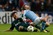 지난 시즌 스페인 프로축구 프리메라리가 우승팀인 ‘호화군단’ 레알 마드리드가 2012~2013 유럽축구연맹(UEFA) 챔피언스리그 16강에 진출했다. 레알 마드리드는 22일 영국 맨체스터의 이티하드 스타디움에서 열린 조별리그 D조 5차전 맨체스터 시티(이하 맨시티)와의 원정 경기에서 1-1로 비겼다. 조별리그 한 경기를 남겨두고 레알 마드리드는 승점 8(2승2무1패)을 기록, 이날 도르트문트에 진 아약스(네덜란드·승점 4)와 격차를 승점 4로 벌려 16강 진출을 확정했다. 반면 지난 시즌 잉글랜드 프리미어리그 우승팀인 맨시티는 조별리그 5경기에서 1승도 거두지 못하고 3무2패(승점 3)에 그쳐 ‘죽음의 조’로 불리는 D조에서 살아남지 못했다. 레알 마드리드는 전반 10분 앙헬 디 마리아가 오른쪽 측면에서 올린 긴 크로스를 카림 벤제마가 수비수 뒤로 달려들며 오른발 논스톱 슈팅으로 마무리해 먼저 골망을 흔들었다. 고전하던 맨시티는 후반 28분 상대 수비수 알바로 아르베올라가 두 번째 경고를 받고 퇴장당해 얻어낸 페널티킥을 세르히오 아게로가 차 넣어 균형을 맞췄지만, 이후 수적 우세에도 경기를 뒤집지 못했다