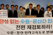 수원~문산간 민자고속도로 전면 재검토를 촉구하는 목소리가 커지고 있다. 민주통합당 김현미(고양일산서)·유은혜(고양일산동)·이학영(군포)·원혜영(부천오정)·김상희(부천소사)·김기식(비례) 의원 등은 10일 국회 정론관에서 시민단체와 함께 기자회견을 열고 수원~문산간 민자고속도로 건설 추진의 원점 재검토를 촉구했다. 이들은 “서울~문산간 민자고속도로에 대한 엉터리 환경영향평가·사업타당성평가로 인해 교통량의 과다 측정, 허위 B/C 분석이 드러났고, 잘못된 내용을 기초로 실시협약을 체결한 국토해양부와 사업자는 국민을 기만하고 국가에 심각한 배임행위를 저지르는 것”이라고 주장했다. 또 “수원~광명간은 수리산 관통 터널공사로 심한 소음을 일으켜 주민 고통은 물론 녹지와 동물 생태계의 파괴가 일어나고 있고, 수백만 시민들이 이용하는 도시자연공원의 훼손도 피할 수 없게 됐다”고 지적했다./임춘원기자 lcw@ 민주통합당 김현미·이학영·원혜영·김상희·김기식 의원이 10일 국회 정론관에서 시민단체와 함께 수원-