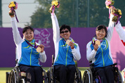 대한민국이 2012 런던 패럴림픽 대회 7일째인 5일(현지시간) 양궁과 수영에서 금메달을 하나씩 추가한 한국은 총 금메달 6개로 종합 13위에 올랐다. 이화숙(46), 고희숙(45), 김란숙(45) 등 3명으로 이루어진 한국 양궁 여자 단체 대표팀은 이날 왕립 포병대 양궁장에서 열린 2012 런던 패럴림픽 양궁 여자 단체전에서 중국을 199-193으로 꺾고 금메달을 목에 걸었다. 이번 대회 양궁에서 나온 첫 금메달이다. 비장애인 올림픽에서 항상 금메달을 안겨주는 양궁은 패럴림픽에서도 ‘효자 종목’이지만 패럴림픽 여자 양궁 단체전에서 한국이 금메달을 딴 것은 이번이 처음이다. 패럴림픽 3연패를 노리던 남자 양궁의 꿈은 결승에서 좌절됐다. 정영주(42), 김석호(48), 이명구(44)로 이루어진 한국 패럴림픽 남자 양궁 대표팀은 남자 단체전에서 러시아에 200-206으로 패배해 은메달을 목에 걸었다. 2004년 아테네 패럴림픽, 2008년 베이징 패럴림픽 남자 양궁 단체전에서 금메달을 땄던 한국은 이번 대회에서 3연패를 노렸지만 고배를 마셨다. 수영에서는 24년 만에 금메달이 나왔다. 임우근은 아쿠아틱스 센터에서 열린 2012 런던 패럴림픽