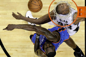 29일(현지시간) 미국 샌안토니오 AT&T 센터에서 열린 2011~2012 NBA 플레이오프 서부 콘퍼런스 결승(7전4승제) 2차전에서 오클라호마시티 선더의 켄드릭 퍼킨스(아래쪽)와 샌안토니오 스퍼스의 보리스 디아우가 볼 다툼을 펼치고 있다. 샌안토니오가 120-111로 승리를 거두며 2연승을 기록했다.