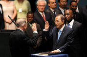 ▲ 연임에 성공한 반기문 유엔 사무총장이 21일(현지시각) 미국 뉴욕의 유엔 본부에서 취임선서를 하고 있다. 이날 오후 열린 총회에서 192개 회원국은 만장일치로 반 총장의 연임안을 최종 통과 시켰다. 반 총장은 한국인으로는 처음으로, 아시아인으로는 우 탄트 이후 45년 만에 유엔 사무총장에 재선됐다. 반 총장은 내년 1월1일 부터 5년간 다시 유엔을 이끌게 됐다./연합뉴스