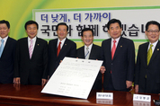 민주당 손학규 대표가 4일 한-유럽연합(EU) 자유무역협정(FTA) 비준안 처리 문제로 4.27 재보선 승리 일주일만에 새로운 시험대에 섰다. 손 대표는 이날 여야가 국회 본회의에서 처리키로 한 한-EU FTA 비준안과 관련한 ‘여야정 합의안(案)’을 파기하는 승부수를 던졌다. 그는 이날 두 차례에 걸친 비공개 의원총회에서 FTA 피해대책 미흡과 야권의 정책연대 위반 가능성을 이유로 들어 “여야 합의안에 반대할 수밖에 없다”고 밝혔다. 특히 민주노동당 이정희 대표와 진보신당 조승수 대표 등이 전날 밤부터 국회 중앙홀에서 비준 저지 농성에 돌입한 것을 거론하며 “야4당 정책합의에 대해 충분한 협의를 거치지 않은 점은 유감이다”라고 말했다. 비준안 찬반이 각각 중도와 진보의 가치를 대변하는 것으로 받아들여지는 상황에서 그는 우선 진보의 손을 잡은 것으로 해석됐다. 손 대표 주변에선 “현 상황에서 적극적 찬성 입장을 개진한다면 야권 내에서 그 책임을 손 대표가 다 뒤집어쓸 수 있다”는 신중론이 우세했던 것으로 알려졌다. 민주노동당, 진보신당 등 연대의 대상인 다른 야당들이 비준안 처리에 거세게 반발하고 있는 상황에서 자칫 손 대표가 4.27 재보선 승리 후 줄곧