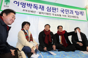 민주당 손학규 대표가 혹한 속에서 ‘노숙투쟁’을 이어가고 있다. 전날 인천을 시작으로 새해 예산안 무효화를 위한 전국 순회에 들어간 그는 15일 충남 천안 집회에 앞서 천안역 광장에 천막을 치고 하룻밤을 묵었다. 주변에서는 건강을 우려, 숙박시설 이용을 권유했지만 “진정성 있게 해야 한다”며 한사코 풍찬노숙을 자청했다는 후문이다. 특히 한밤중 전기가 나가는 바람에 살을 에는 듯한 추위와 밤새 싸워야 했다. 손 대표는 앞서 13일 독감 예방 주사를 맞는 등 한겨울 ‘야전’ 채비를 단단히 했다. 한 지지자가 건넨 자주색 목도리는 그의 결연함을 과시하는 ‘트레이드 마크’가 됐다. 손 대표는 영하 10도를 밑도는 동장군의 기세에 맞서기 위해 등산화와 등산양말을 신고 내복 등을 몇 겹씩 껴입은 중무장 차림으로 거리에 나서고 있다. 하지만 밤늦게까지 찾아오는 시민들을 맞느라 하루에 4∼5시간 정도밖에 눈을 붙이지 못하고 천막 안에서 배달 음식으로 끼니를 때우는 게 다반사다. 유일한 낙이라면 아침마다 천막 근처 대중목욕탕에 가서 언 몸을 녹인다는 것. 한 측근은 “체력 하나는 타고 난 것 같다”면서 “그러나 강추위 속 장외생활이 장기화되면 건강을 해칠 수 있어 걱정”이라