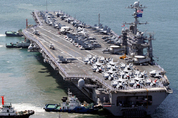 ▲ 28일부터 내달 1일까지 서해에서 최고수준의 한미연합훈련이 실시된다. 이번 훈련은 북한의 군사적 도발에 대응한 일련의 계획된 훈련으로, 항공기의 실무장 폭격과 해상사격 등 최대규모로 진행된다. 사진은 이번 연합훈련에 참가하는 미국 항공모함 조지 워싱턴호(9만7천t급). /연합뉴스