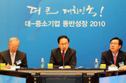 이명박 대통령이 29일 대기업과 중소기업의 동반성장 전략을 통해 한국형 글로벌 중소기업인 ‘스몰 자이언츠(small giants)’를 대거 육성하겠다고 말했다. 또 이를위해 대통령 경제수석이 이끄는 범 부처 차원의 ‘대기업·중소기업 동반성장 추진점검반’을 구성해 매달 관련 정책을 조정하고 점검하겠다고 밝혔다. 이 대통령은 이날 오전 청와대에서 대기업과 중소기업 CEO와 경제단체장, 경제전문가, 당·정·청 관련 인사들이 참석한 가운데 열린 국민경제대책회의에서 이러한 대기업·중소기업 동반성장 전략의 최종 지향점을 제시했다. 이 대통령은 이날 회의에서 “한국에서도 독일의 ‘히든 챔피언(hidden champion)’과 일본의 ‘장수 기업’의 장점을 접목한 글로벌 중소기업인 ‘스몰 자이언츠’가 대거 나타날 것”이라고 말했다. 중소기업중앙회는 올해 1월 7일 신년인사회에서 독일의 히든 챔피언과 일본의 장수기업, 한국의 스피드 경영을 융합해 2020년에는 세계 1위의 기술력으로 지속성장을 구가하는 한국형 스몰 자이언츠의 개념을 제시한 바 있다. 이 대통령은 이어 “대기업과 중소기업이 공동성장해야 한다는 것을 강조했더니 일부 언론이 ‘정부가 시장경제를 역행하고 있다’고
