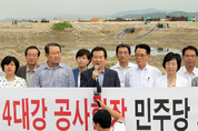 민주당이 7.28 재보선 공식 선거운동 개시일을 하루 앞둔 14일 ‘4대강 심판론’을 다시 꺼내들었다. 이번 선거를 6.2 지방선거에 이은 ‘제2의 정권심판’으로 규정한 민주당은 이날 여주보 공사현장에서 최고위원-원내대표단-4대강특위 연석회의를 연 뒤 ‘물고기 떼죽음’ 현장을 시찰하며 4대강 이슈 띄우기에 집중했다. 정세균 대표는 “지난 지방선거에서 국민은 4대강 사업을 치수사업으로 하라고 명령했지만 이 정권은 이를 거역하고 밀어붙이고 있다”며 “아직도 국민의 뜻을 무시하고 무능과 독선에 빠져있는 이 정권을 재보선을 통해 최종 심판해야 한다”고 말했다. 박주선 최고위원도 “국민 70∼80%가 중단하라고 했건만 4대강을 이렇게 파헤쳐 파괴하는 공사야말로 범범행위다”며 사업중단을 촉구했다. 박지원 원내대표는 “예산국회에서 4대강 예산이 금년보다 훨씬 증액된 내용을 국민에게 알리고 삭감하기 위해 투쟁할 것“이라고 밝혔다. 민주당이 4대강 사업을 전면에 들고나선 데에는 최대 승부처인 서울 은평을의 한나라당 이재오 후보가 과거 ‘한반도 대운하 전도사’를 자처했다는 점을 겨냥, 기선을 제압하겠다는 포석도 깔려있다. 이미경 사무총장은 오전 KBS 라디오 인터뷰에서 “4대