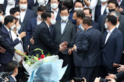 국민의힘은 30일 윤석열 전 검찰총장의 '데뷔전'에 상기된 분위기다. 사실상의 출마 선언으로 여겨지는 전날 회견을 놓고 당내에선 긍정적 반응이 주를 이뤘다. 특유의 직설적이고 격정적인 단어 선택과 화법으로 정권교체의 필요성을 강조하면서 반문정서 결집에 성공했다는 평가 속에 띄우기에 나섰다. 윤 전 총장과 친분이 있는 법조계 인사들은 한층 고무된 표정이다. 권성동 의원은 MBC 라디오에서 "나름대로 성공적인 정치 데뷔의 순간"이라고 평가했다. 강원권 최다선인 권 의원은 윤 전 총장과는 검찰 선후배이자 '친구' 사이로 알려졌다. 같은 당 의원 24명과 함께 전날 선언식 행사장을 격려 방문하기도 했다. 당 대외협력위원장을 맡은 권영세 의원은 CBS 라디오에서 "자유민주주의와 법치주의, 상식과 공정 등 본인이 중시하고 또 가장 잘 실현할 수 있는 가치에 관해서 이야기 한 자리였다"면서 "무난하게 잘했다고 평가한다"고 밝혔다. 김재원 최고위원은 "어떤 방향으로 나아갈 것이냐 하는 것은 명백히 밝혔다는 점에서 저희로서는 상당히 긍정적으로 생각한다"고 말했다. 정미경 최고위원도 "똘똘한 출마선언문"이었다며 특히 현 정부를 비판한 "약탈 정권"을 연설문의 키워드로 꼽았다.