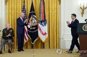 문재인 대통령과 조 바이든 미국 대통령은 21일 오후(현지시간) 백악관에서 열린 한국전 참전용사 명예훈장 수여식에 나란히 참석했다. 바이든 대통령이 94세인 한국전쟁 영웅 랠프 퍼켓 주니어 퇴역 대령에게 미군 최고의 영예인 명예훈장을 수여하는 자리였다. 미국 대통령이 명예훈장을 수여하는 행사에 외국 대통령이 참석한 것은 문 대통령이 처음이다. 바이든 대통령이 명예훈장을 수여한 것도 취임 후 처음이었다. 문 대통령의 미국 방문에 맞춰 한국전 영웅에게 명예훈장을 주는 이 자리에서 양국 정상은 한목소리로 한미동맹의 중요성을 강조했다. 바이든 대통령은 "강력한 한미 동맹은 미군과 한국군의 희생과 용기로 만들어졌다"며 "문 대통령을 모신 것은 양국이 함께 이룬 성과를 보여준다"고 말했다. 문 대통령 역시 "한국의 평화와 자유를 함께 지켜준 미국 참전 용사의 힘으로 한국은 폐허에서 다시 일어나 번영을 이뤘다"면서 "영웅들의 피로 맺어진 한미 동맹은 한반도를 넘어 평화와 번영의 핵심축이 됐다"고 밝혔다. 중위로 한국전쟁에 참전한 퍼켓 대령은 1950년 11월 25∼26일 청천강 북쪽의 전략적 요충지인 205고지 점령 과정에서 중공군에 맞서 활약했다고 백악관이 설명했다.