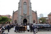 고(故) 정진석 추기경의 장례미사가 거행된 1일 서울 명동성당에 모인 추모객들은 차분한 분위기 속에서 정 추기경의 마지막 길을 배웅했다. 정례미사가 끝날 무렵엔 곳곳에서 눈물을 보였다. 이날 장례미사는 오전 10시에 시작해 2시간5분 동안 진행됐다. '코로나19' 방역수칙에 따라 명동성당 대성전 안에는 230명으로 입장이 제한됐다. 대성전 옆 문화관 꼬스트홀도 사제와 수도자, 유족, 신자 대표만 들어갈 수 있어 일반 추모객들은 명동성당 옆 영성센터 강당(300여명) 또는 바깥쪽 뜰에서 스마트폰을 이용한 온라인 생중계나 스피커를 통해 음성을 듣는 방식으로 장례미사에 참여했다. 대성전이나 강당에 들어가지 못한 추모객 300여명은 가랑비가 살짝 내리고 바람이 부는 쌀쌀한 날씨 속에서도 끝까지 자리를 지켰다. 이들은 장례미사 순서인 일부 성가와 기도 등을 따라 말하면서 고인의 넋을 기렸다. 서울대교구 측은 원래 바깥쪽 뜰에 대형 스크린과 의자를 마련해 추모객들이 장례미사 영상을 볼 수 있게 편의를 제공할 계획이었지만, 이날 종일 비가 온다는 일기예보를 고려해 별도의 공간을 마련하지는 않았다. 한 추모객은 목걸이용 큰 묵주를 오른손에 걸친 상태에서 눈을 감고 나직하게